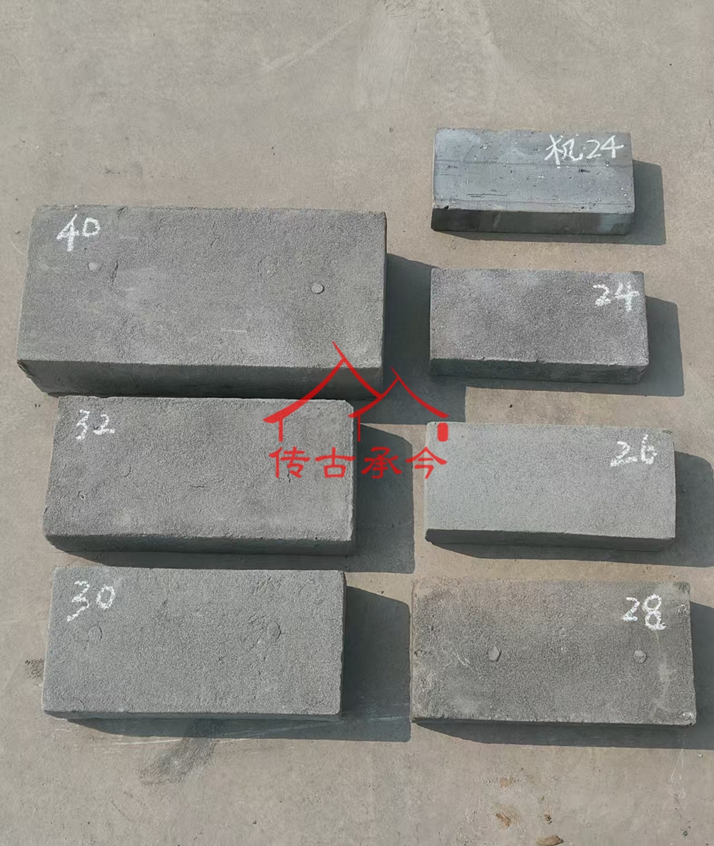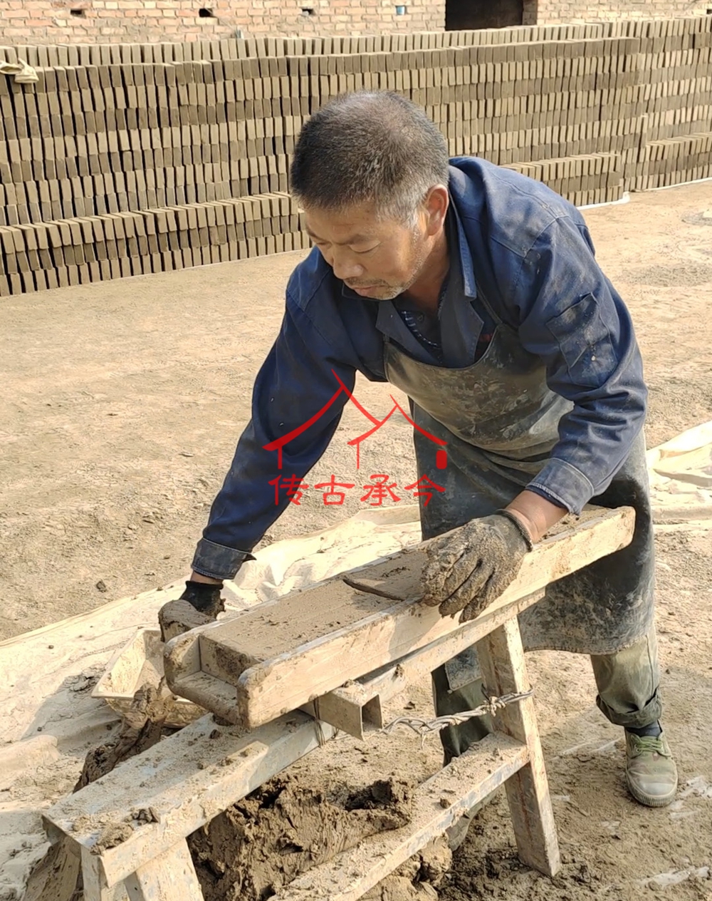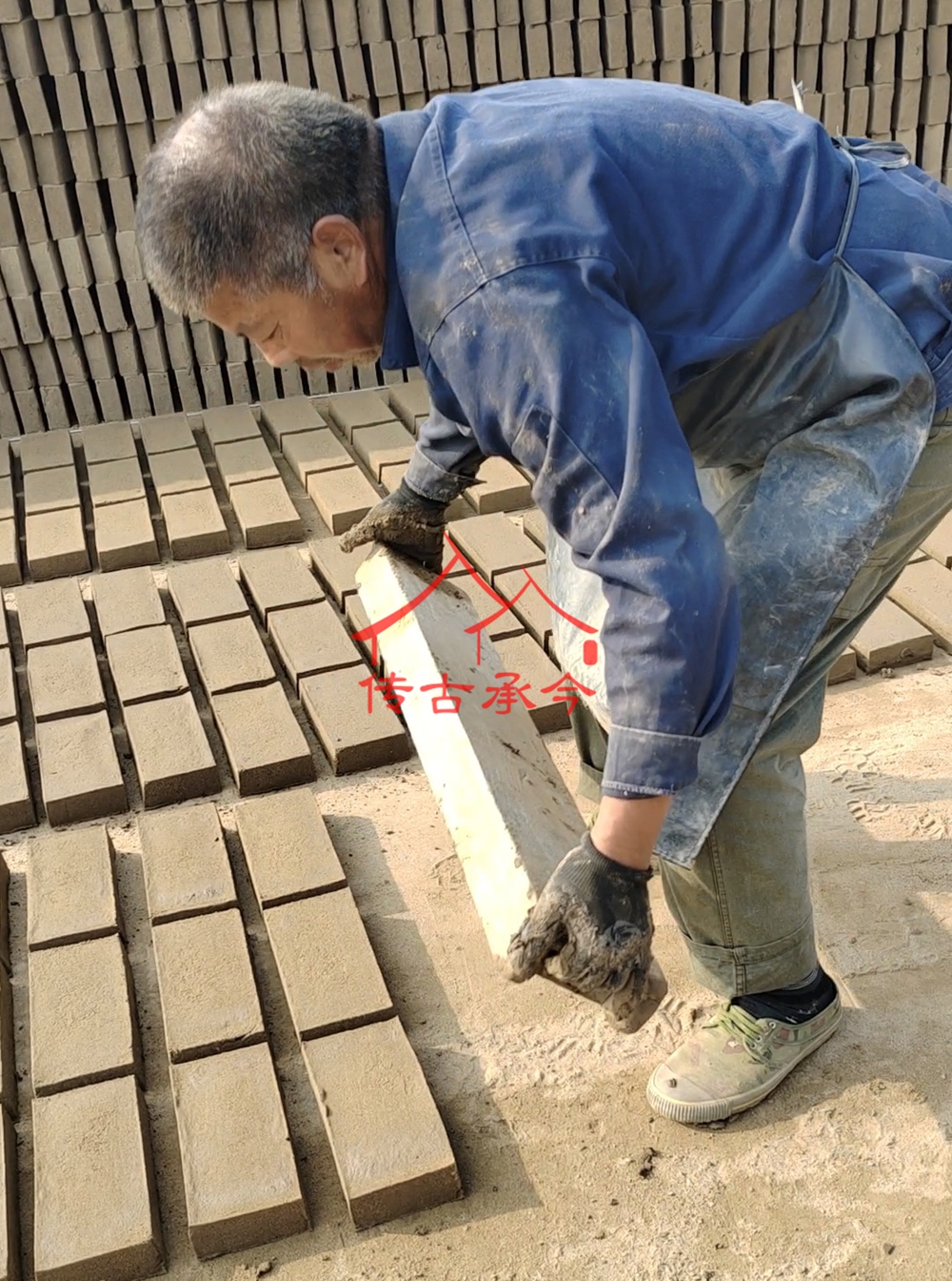 古法手工制作青砖,所有工艺流程全部人工操作。上选优质粘土,凉晒、翻搅,去暴质、增柔性,再经筛选;用中性水和泥、练泥、打浆,置稠泥于框中,着铁线弓戛平其面而成坯型,存阴棚内,日日转筑,阴7日后,用木板将坯面压平、压实,移至亭子间花架码放,自然阴干;然后装窑、烘干,在窑内经一个月左右不同火力焙烧,再窨水,前后十几道工序而后出窑。