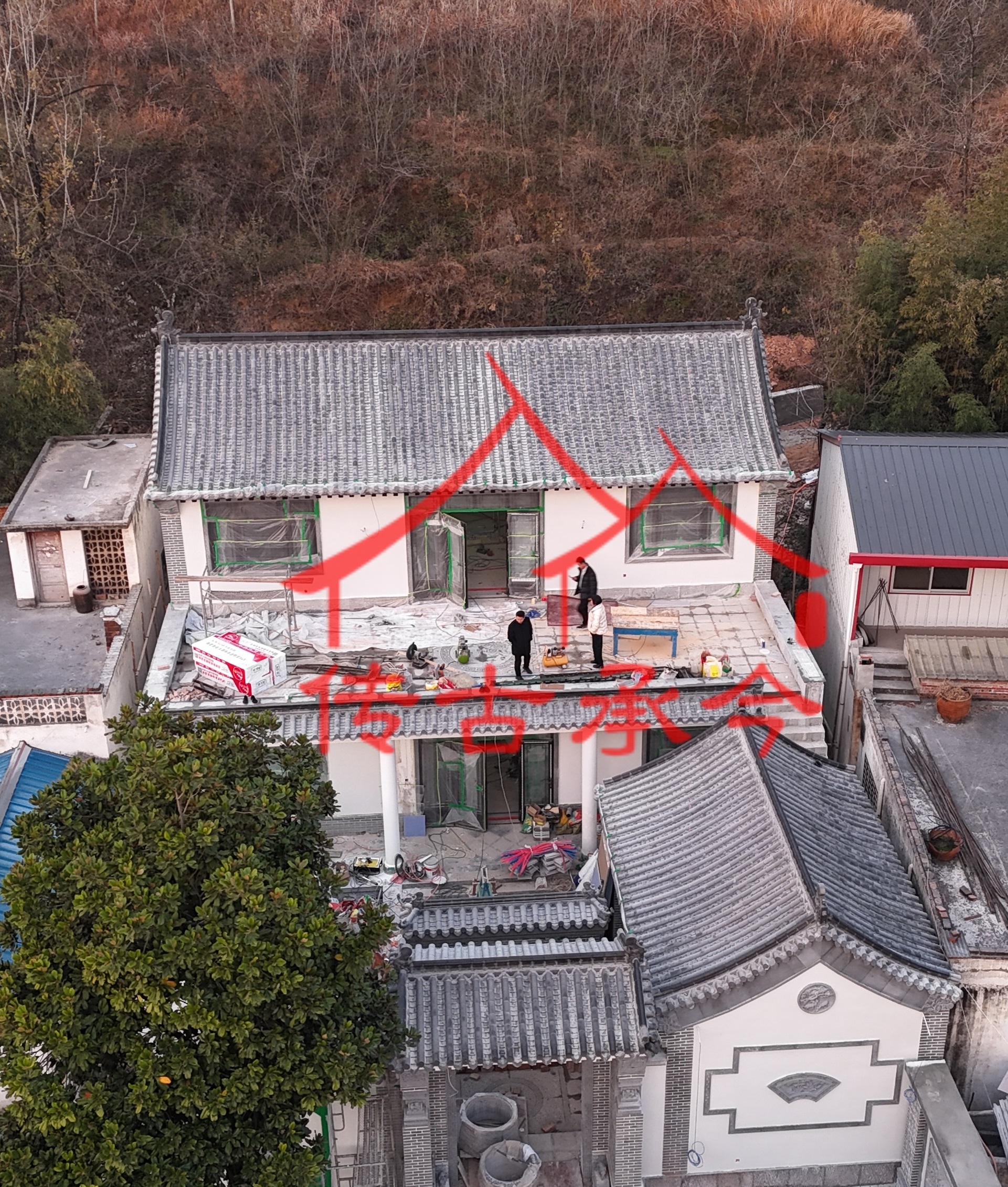 • 施工状态:从现场看主体结构已完成,正处于外立面和内部装修阶段,门楼和院墙的中式构件已经安装完毕,整体效果初显。