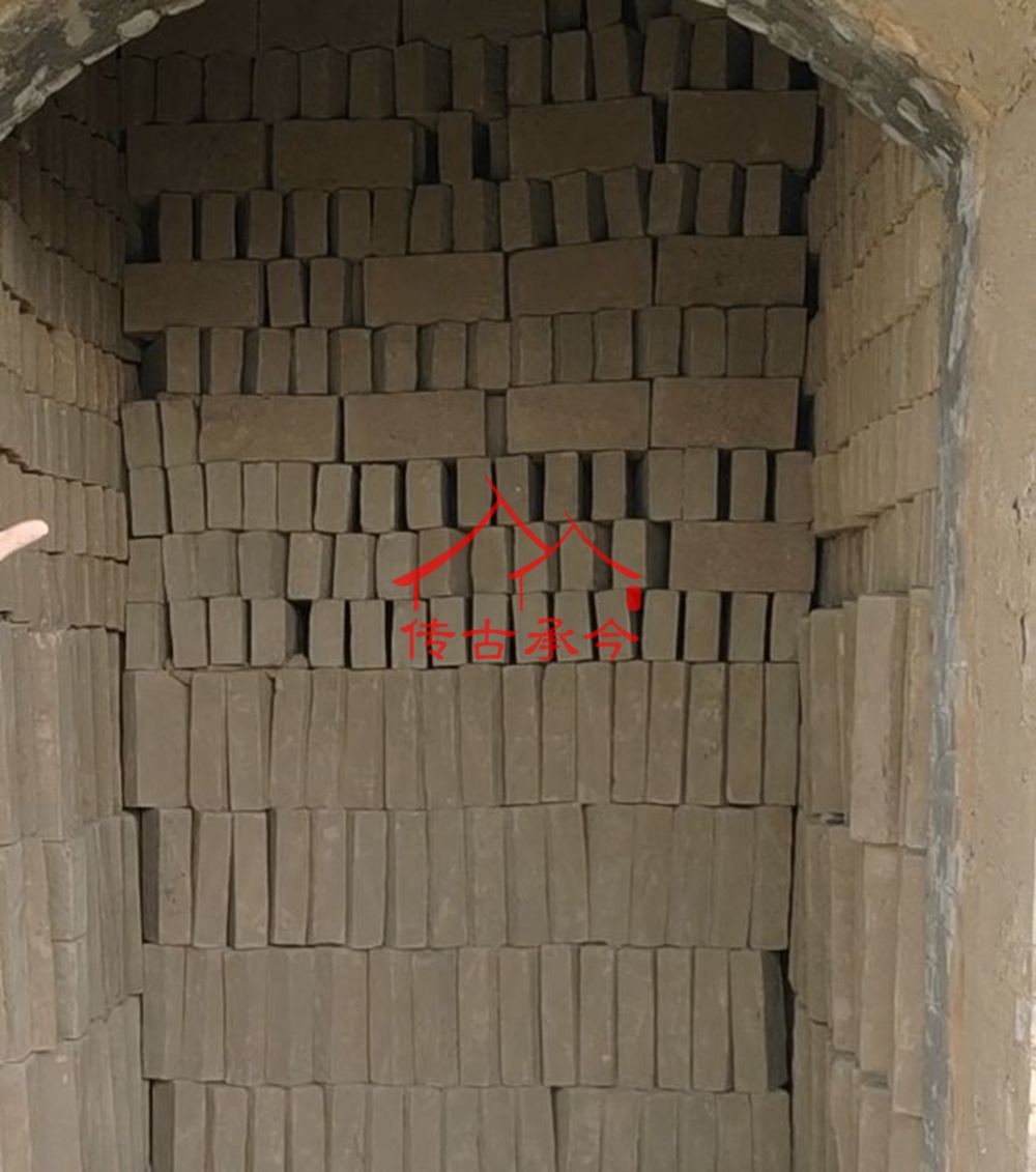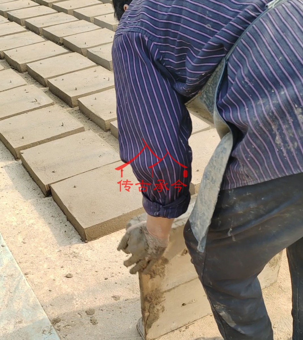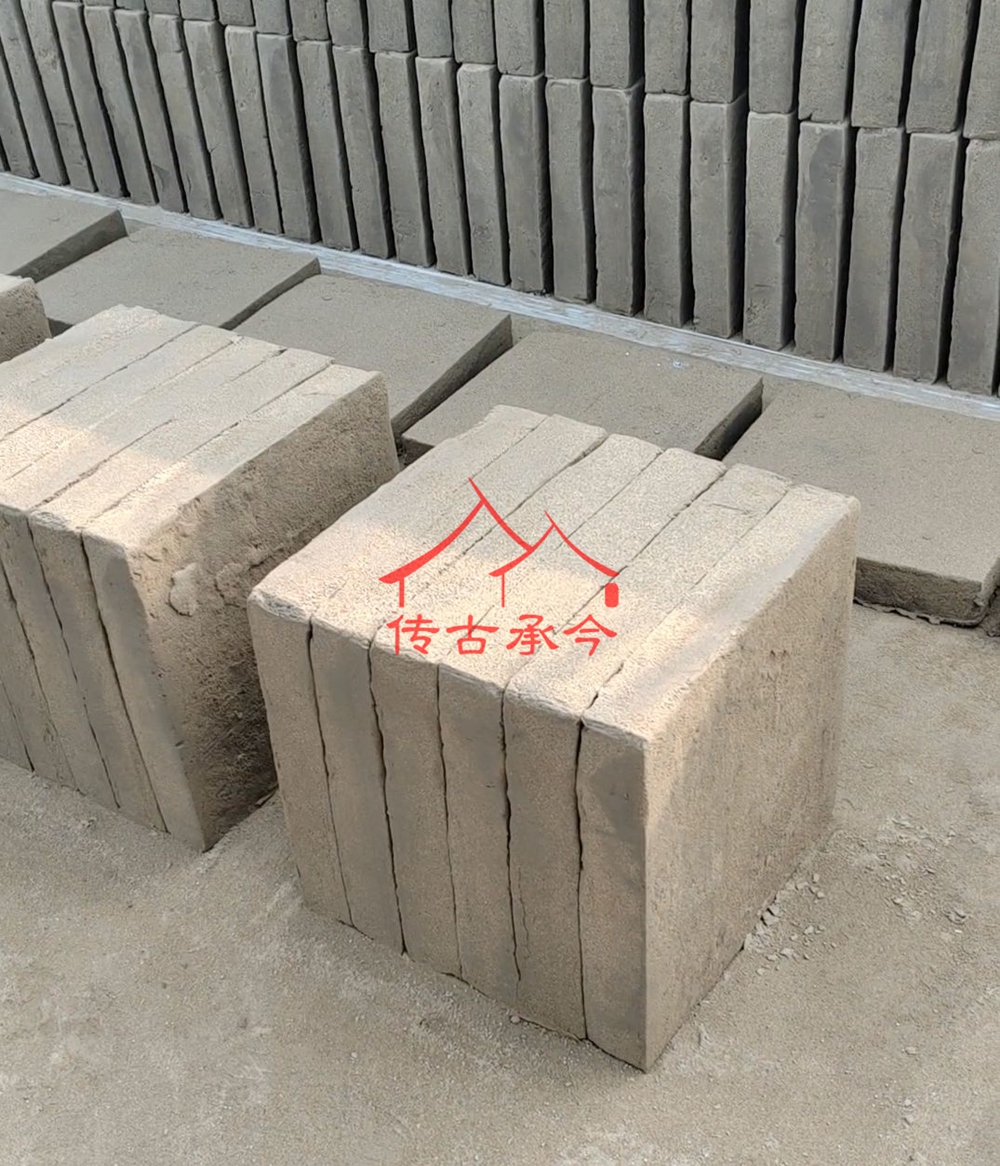 古法手工制作青砖,所有工艺流程全部人工操作。上选优质粘土,凉晒、翻搅,去暴质、增柔性,再经筛选;用中性水和泥、练泥、打浆,置稠泥于框中,着铁线弓戛平其面而成坯型,存阴棚内,日日转筑,阴7日后,用木板将坯面压平、压实,移至亭子间花架码放,自然阴干;然后装窑、烘干,在窑内经一个月左右不同火力焙烧,再窨水,前后十几道工序而后出窑。