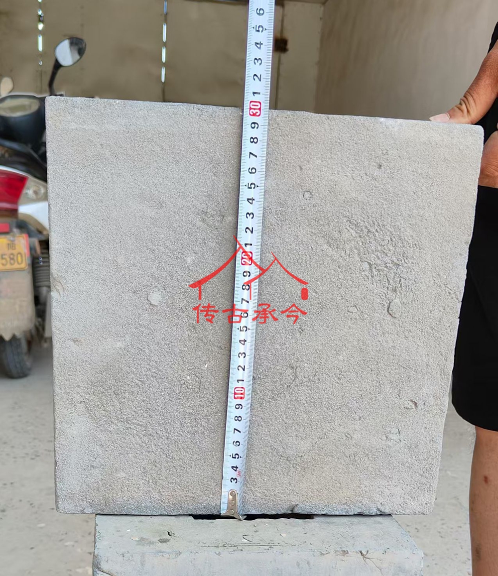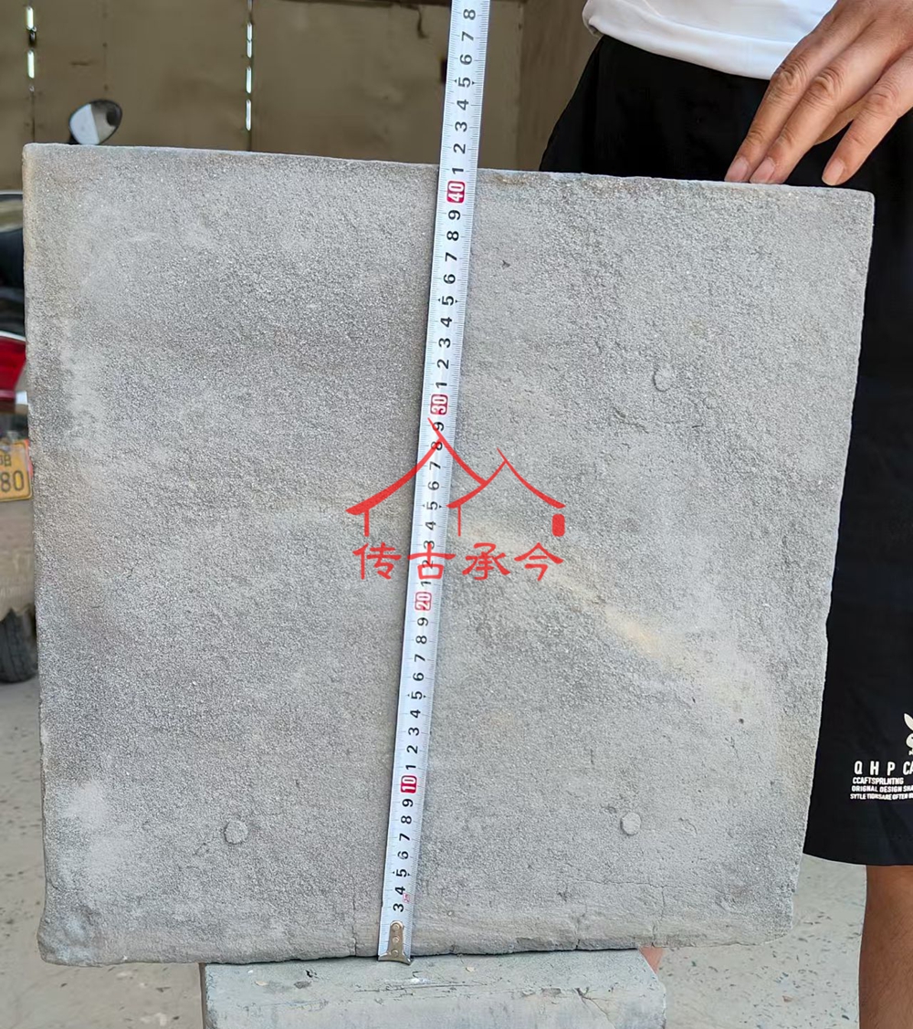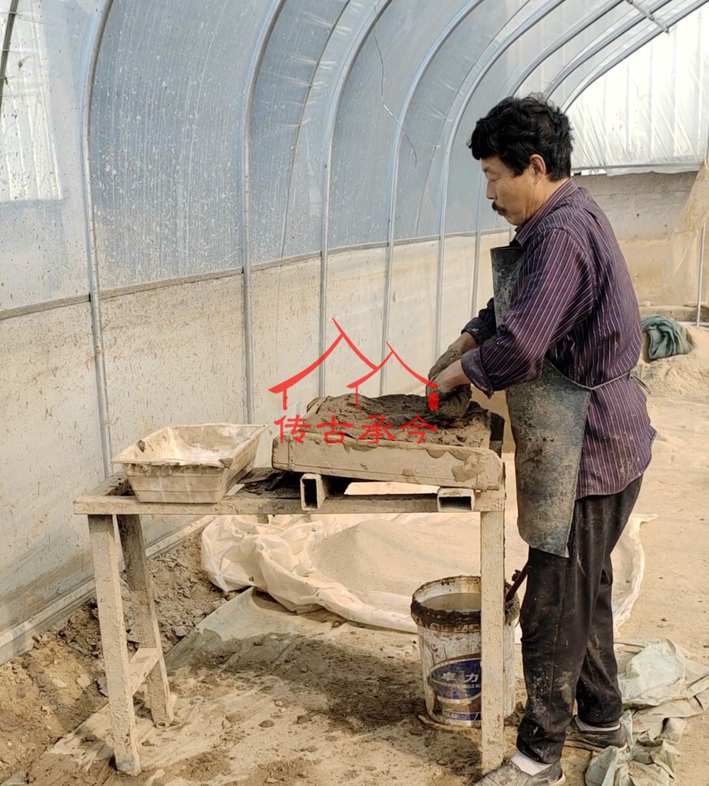 古法手工制作青砖,所有工艺流程全部人工操作。上选优质粘土,凉晒、翻搅,去暴质、增柔性,再经筛选;用中性水和泥、练泥、打浆,置稠泥于框中,着铁线弓戛平其面而成坯型,存阴棚内,日日转筑,阴7日后,用木板将坯面压平、压实,移至亭子间花架码放,自然阴干;然后装窑、烘干,在窑内经一个月左右不同火力焙烧,再窨水,前后十几道工序而后出窑。