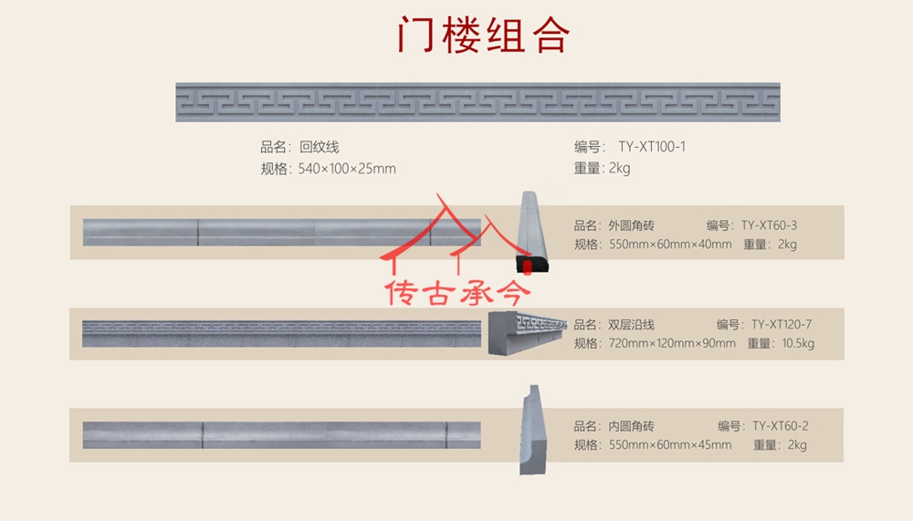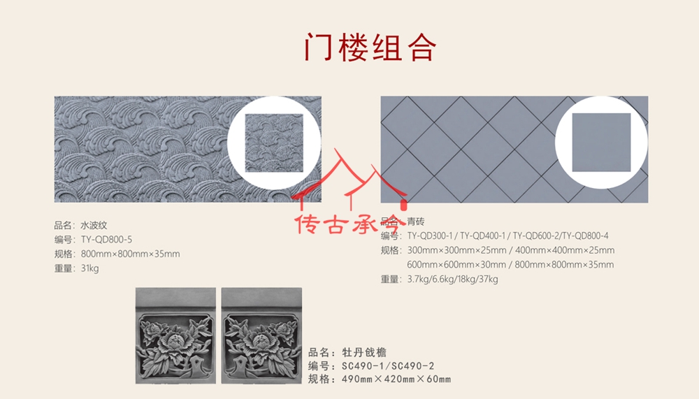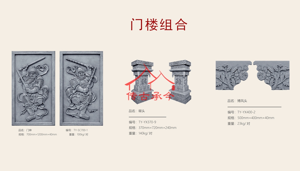 企业产品 门楼砖雕组合 Posted by Courtyard design On 09/09/2025 0 comments 冷陶砖雕门楼组合: 10公分回纹线每米26元 6公分外圆角砖每米16元 12公分双层沿线每米80元 6公分内圆角砖每米14元 800×800水波纹每米175元 400×400青砖每米60元 490×420牡丹戗檐一对330元 1200×700门神一对1000元 720×370墀头一对1400元 400×500博风头一对300元 宽3.3米x深2.4米门楼组合一套材料7000元